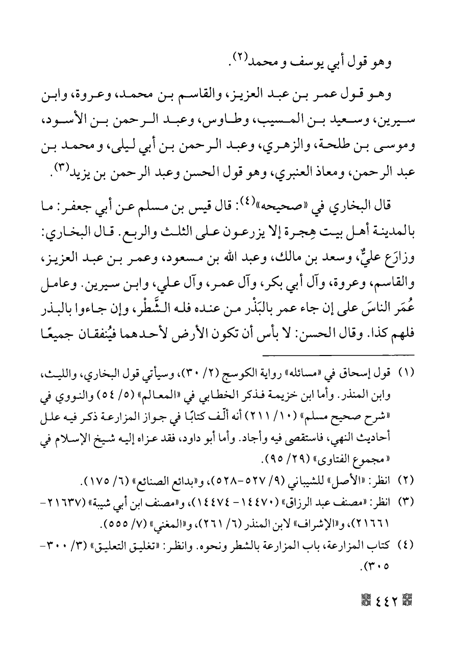 (¬١) قول إسحاق في «مسائله» رواية الكوسج (٢/ ٣٠)، وسيأتي قول البخاري، والليث، وابن المنذر. وأما ابن خزيمة فذكر الخطابي في «المعالم» (٥/ ٥٤) والنووي في «شرح صحيح مسلم» (١٠/ ٢١١) أنه ألّف كتابًا في جواز المزارعة ذكر فيه علل أحاديث النهي، فاستقصى فيه وأجاد. وأما أبو داود، فقد عزاه إليه شيخ الإسلام في «مجموع الفتاوى» (٢٩/ ٩٥).