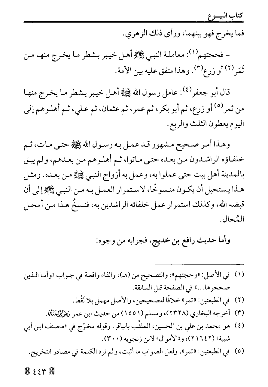 = فحجتهم (¬١): معاملة النبي - صلى الله عليه وسلم - أهل خيبر بشطر ما يخرج منها من ثَمَر (¬٢) أو زرع (¬٣). وهذا متفق عليه بين الأمة.