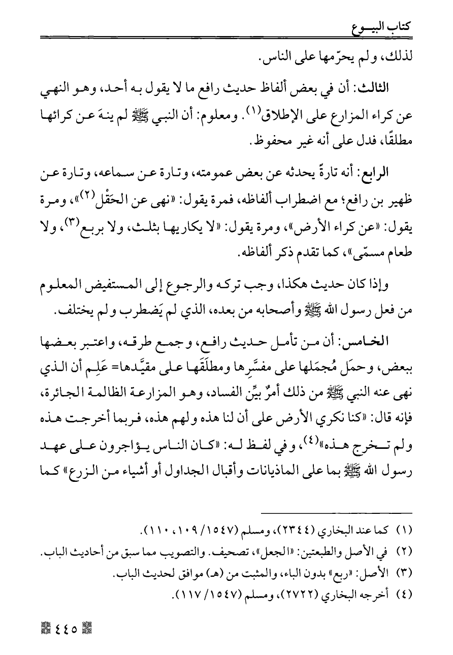 الثالث: أن في بعض ألفاظ حديث رافع ما لا يقول به أحد، وهو النهي عن كراء المزارع على الإطلاق (¬١). ومعلوم: أن النبي - صلى الله عليه وسلم - لم ينهَ عن كرائها مطلقًا، فدل على أنه غير محفوظ.