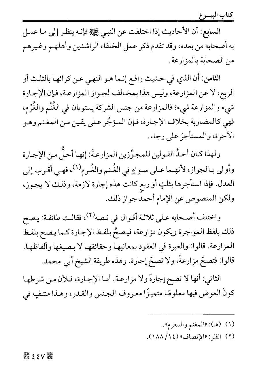 الثامن: أن الذي في حديث رافع إنما هو النهي عن كرائها بالثلث أو الربع، لا عن المزارعة، وليس هذا بمخالف لجواز المزارعة، فإن الإجارة شيء والمزارعة شيء؛ فالمزارعة من جنس الشركة يستويان في الغُنْم والغُرْم، فهي كالمضاربة بخلاف الإجارة، فإن المؤجِّر على يقين من المغنم وهو الأجرة، والمستأجرَ على رجاء.