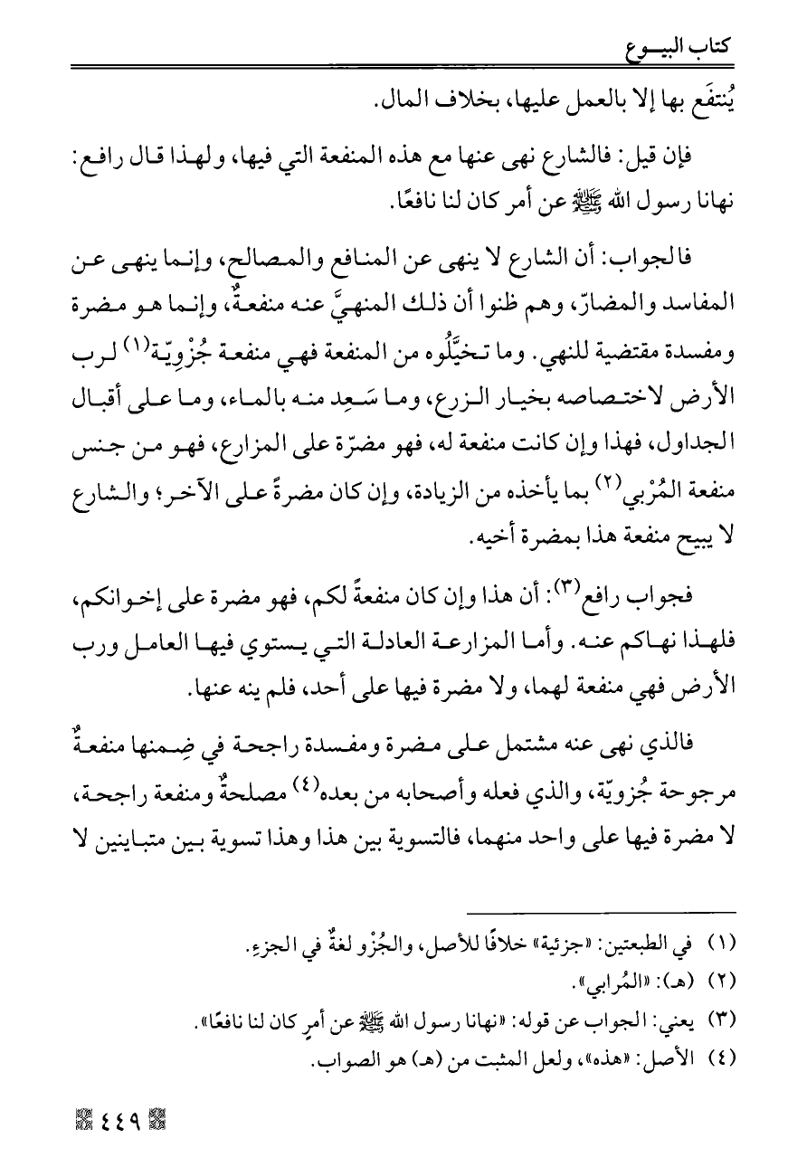 فالجواب: أن الشارع لا ينهى عن المنافع والمصالح، وإنما ينهى عن المفاسد والمضارّ، وهم ظنوا أن ذلك المنهيَّ عنه منفعةٌ، وإنما هو مضرة ومفسدة مقتضية للنهي. وما تخيَّلُوه من المنفعة فهي منفعة جُزْوِيّة (¬١) لرب الأرض لاختصاصه بخيار الزرع، وما سَعِد منه بالماء، وما على أقبال الجداول، فهذا وإن كانت منفعة له، فهو مضرّة على المزارع، فهو من جنس منفعة المُرْبي (¬٢) بما يأخذه من الزيادة، وإن كان مضرةً على الآخر؛ والشارع لا يبيح منفعة هذا بمضرة أخيه.