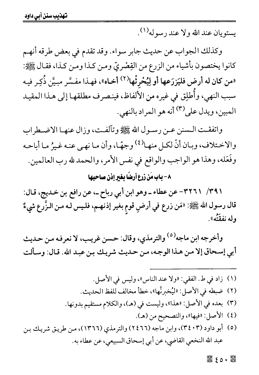 ٣٩١/ ٣٢٦١ - عن عطاء ــ وهو ابن أبي رباح ــ، عن رافع بن خديج، قال: قال رسول الله - صلى الله عليه وسلم -: «مَن زرع في أرضِ قومٍ بغير إذنهم، فليس له من الزَّرع شيءٌ وله نفقَتُه».