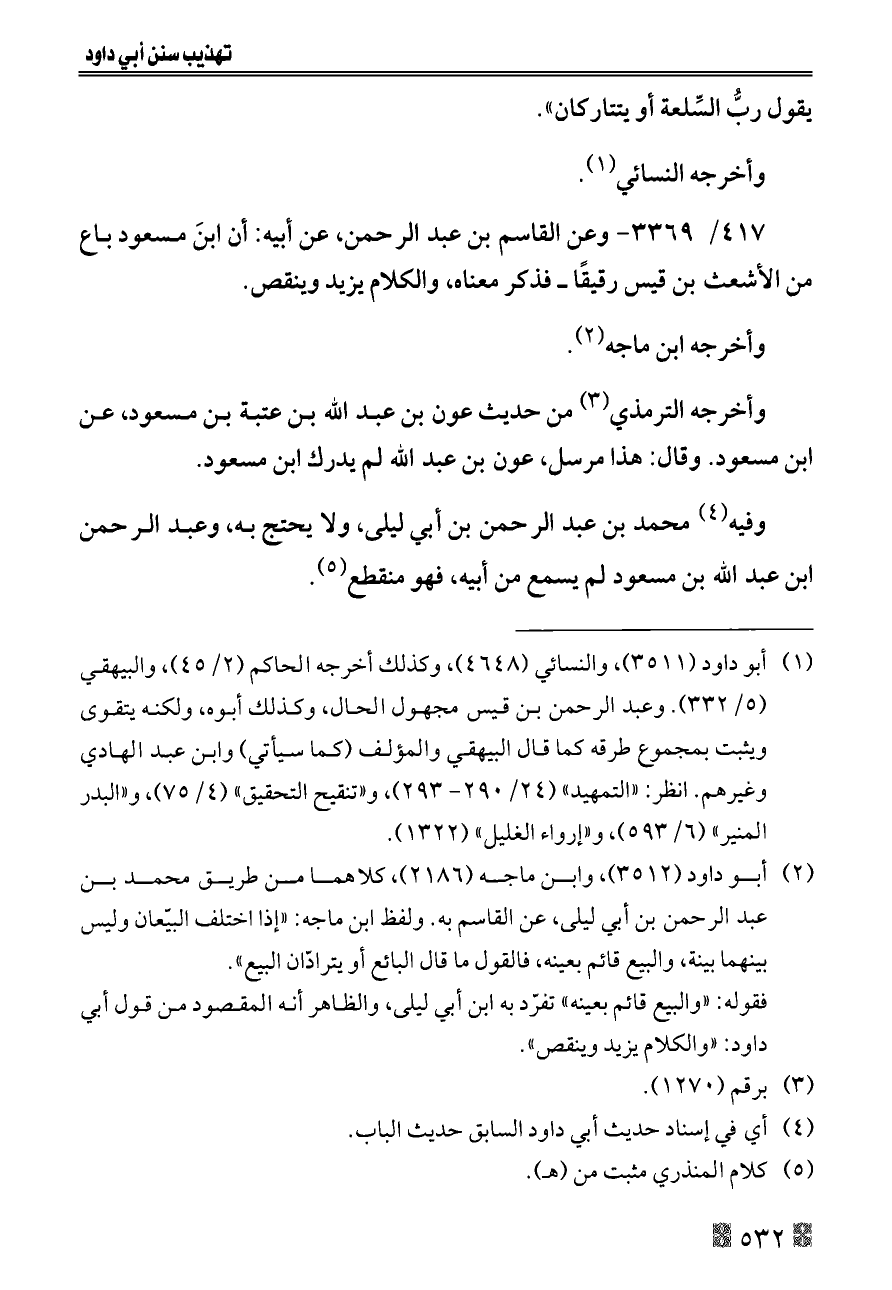 ٤١٧/ ٣٣٦٩ - وعن القاسم بن عبد الرحمن، عن أبيه: أن ابنَ مسعود باع من الأشعث بن قيس رقيقًا ــ فذكر معناه، والكلام يزيد وينقص.