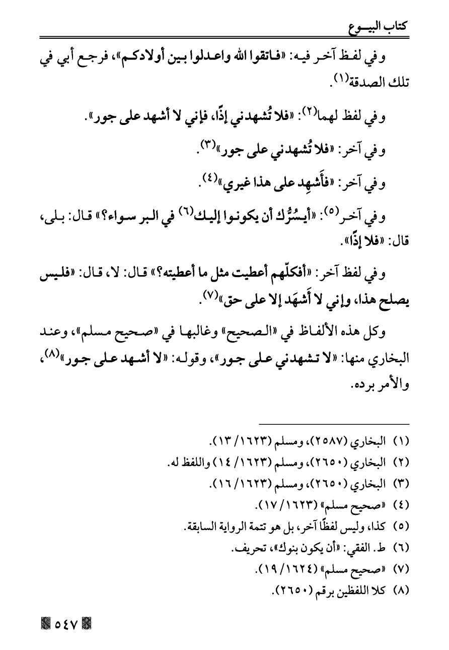 وكل هذه الألفاظ في «الصحيح» وغالبها في «صحيح مسلم»، وعند البخاري منها: «لا تشهدني على جور»، وقوله: «لا أشهد على جور» (¬٨)، والأمر برده.