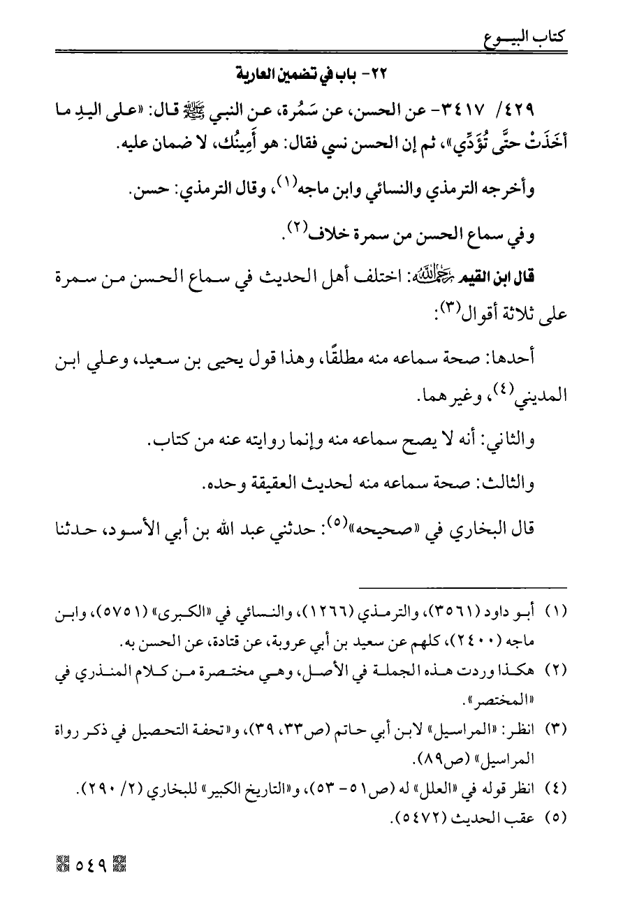 ٤٢٩/ ٣٤١٧ - عن الحسن، عن سَمُرة، عن النبي - صلى الله عليه وسلم - قال: «على اليدِ ما أخَذَتْ حتَّى تُؤَدِّي»، ثم إن الحسن نسي فقال: هو أَمِينُك، لا ضمان عليه.