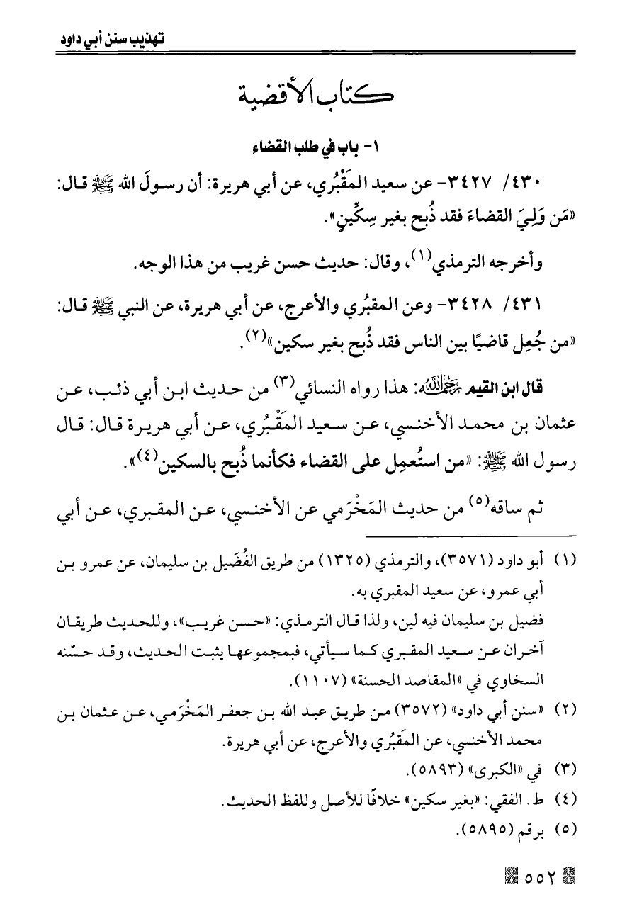 ٤٣٠/ ٣٤٢٧ - عن سعيد المَقْبُري، عن أبي هريرة: أن رسولَ الله - صلى الله عليه وسلم - قال: «مَن وَلِيَ القضاءَ فقد ذُبح بغير سِكِّينٍ».