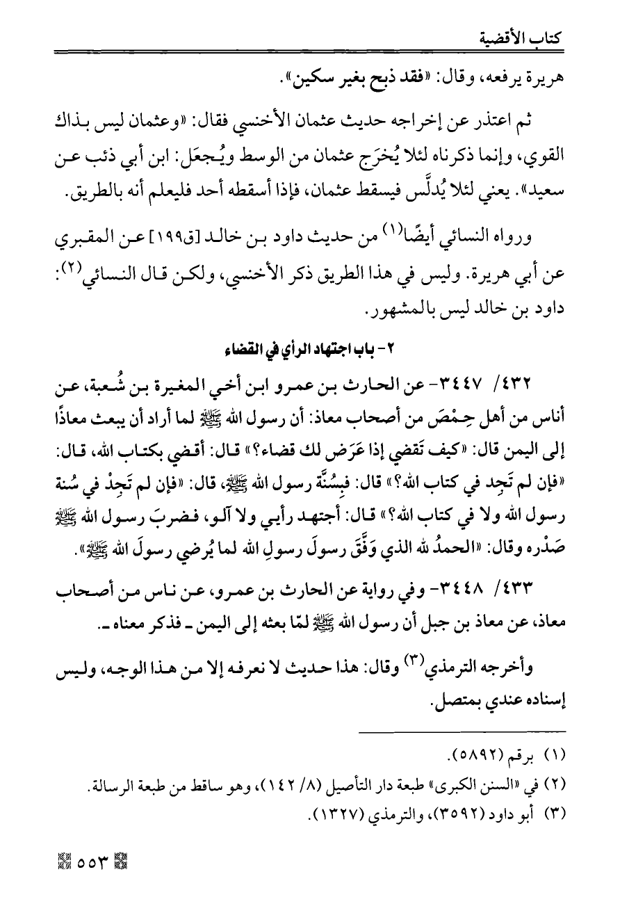 ٤٣٢/ ٣٤٤٧ - عن الحارث بن عمرو ابن أخي المغيرة بن شُعبة، عن أناس من أهل حِمْصَ من أصحاب معاذ: أن رسول الله - صلى الله عليه وسلم - لما أراد أن يبعث معاذًا إلى اليمن قال: «كيف تَقضي إذا عَرَض لك قضاء؟» قال: أقضي بكتاب الله، قال: «فإن لم تَجِد في كتاب الله؟» قال: فبِسُنَّة رسول الله - صلى الله عليه وسلم -، قال: «فإن لم تَجِدْ في سُنة رسول الله ولا في كتاب الله؟» قال: أجتهد رأيي ولا آلو، فضربَ رسول الله - صلى الله عليه وسلم - صَدْره وقال: «الحمدُ لله الذي وَفَّقَ رسولَ رسولِ الله لما يُرضي رسولَ الله - صلى الله عليه وسلم -».