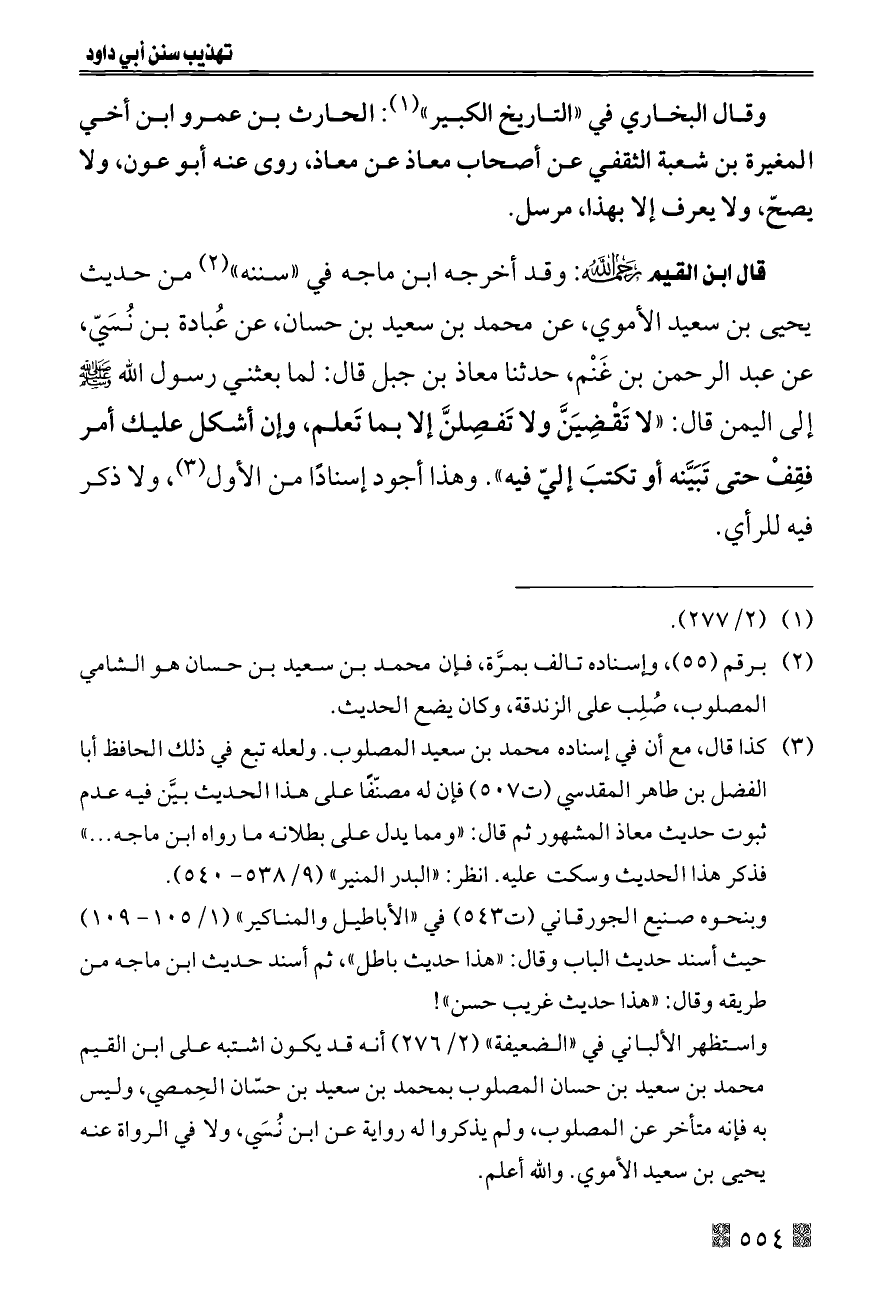 (¬٣) كذا قال، مع أن في إسناده محمد بن سعيد المصلوب. ولعله تبع في ذلك الحافظ أبا الفضل بن طاهر المقدسي (ت ٥٠٧) فإن له مصنّفًا على هذا الحديث بيَّن فيه عدم ثبوت حديث معاذ المشهور ثم قال: «ومما يدل على بطلانه ما رواه ابن ماجه ... » فذكر هذا الحديث وسكت عليه. انظر: «البدر المنير» (٩/ ٥٣٨ - ٥٤٠).