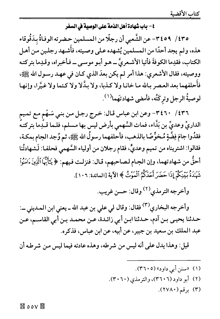 ٤٣٦/ ٣٤٦٠ - وعن ابن عباس قال: خرج رجل من بني سَهْمٍ مع تميمٍ الداريِّ وعديِّ بن بَدَّاء، فمات السَّهمي بأرض ليس بها مسلم، فلما قدِما بتركته فقدُوا جامَ فِضَّةٍ مُخوًّصًا بالذهب، فأحلفهما رسولُ الله - صلى الله عليه وسلم -، ثم وُجد الجام بمكة، فقالوا: اشتريناه من تميم وعديٍّ، فقام رجلان من أولياء السَّهمي فحلفا: لَشهادتُنا أحقُّ من شهادتهما، وإن الجام لصاحبهم، قال: فنزلت فيهم: {يَاأَيُّهَا الَّذِينَ آمَنُوا شَهَادَةُ بَيْنِكُمْ إِذَا حَضَرَ أَحَدَكُمُ الْمَوْتُ} الآية [المائدة: ١٠٦].