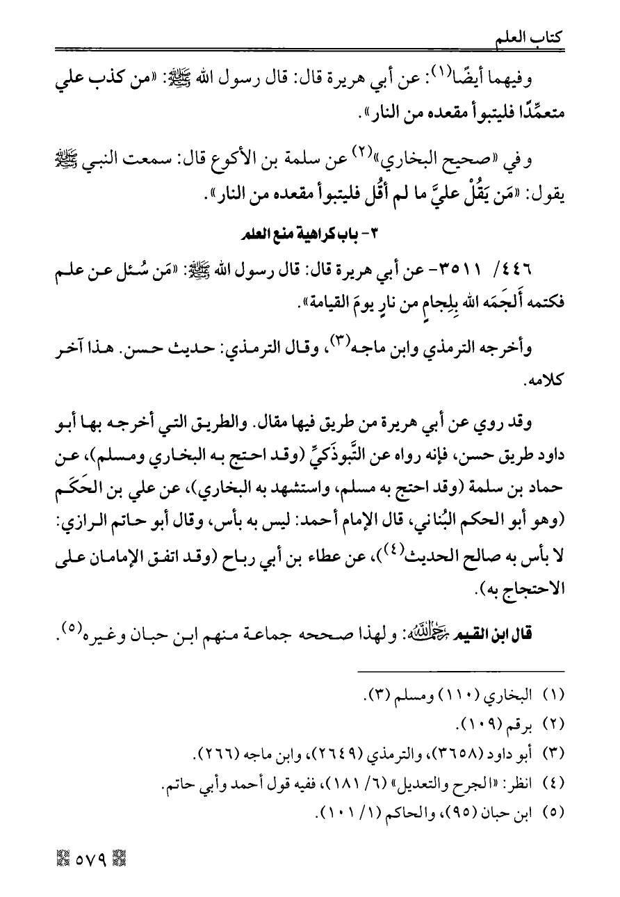 ٤٤٦/ ٣٥١١ - عن أبي هريرة قال: قال رسول الله - صلى الله عليه وسلم -: «مَن سُئل عن علم فكتمه أَلجَمَه الله بِلِجامٍ من نارٍ يومَ القيامة».