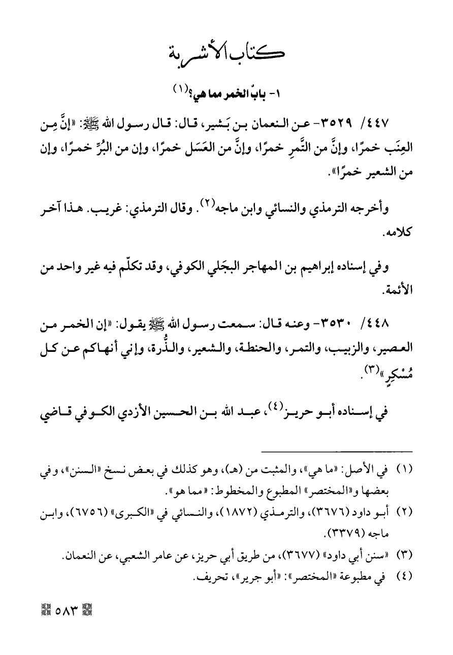 ٤٤٧/ ٣٥٢٩ - عن النعمان بن بَشير، قال: قال رسول الله - صلى الله عليه وسلم -: «إنَّ مِن العِنَب خمرًا، وإنَّ من التَّمرِ خمرًا، وإنَّ من العَسَل خمرًا، وإن من البُرِّ خمرًا، وإن من الشعير خمرًا».
