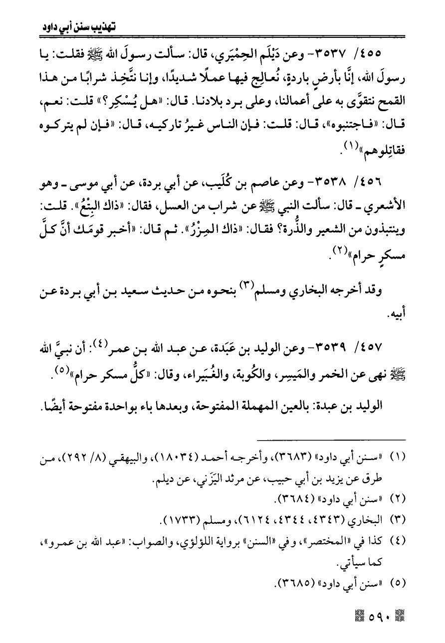 ٤٥٥/ ٣٥٣٧ - وعن دَيْلَم الحِمْيَري، قال: سألت رسولَ الله - صلى الله عليه وسلم - فقلت: يا رسولَ الله، إنَّا بأرضٍ باردةٍ، نُعالِج فيها عملًا شديدًا، وإنا نتَّخِذ شرابًا من هذا القمح نتقوَّى به على أعمالنا، وعلى برد بلادنا. قال: «هل يُسْكِر؟» قلت: نعم، قال: «فاجتنبوه»، قال: قلت: فإن الناس غيرُ تاركيه، قال: «فإن لم يتركوه فقاتِلوهم» (¬١).
