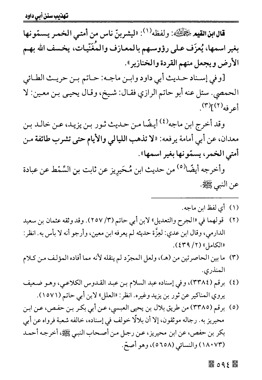 وقد أخرج ابن ماجه (¬٤) أيضًا من حديث ثور بن يزيد، عن خالد بن معدان، عن أبي أمامة يرفعه: «لا تذهب الليالي والأيام حتى تشرب طائفة من أمتي الخمر، يسمّونها بغير اسمها».