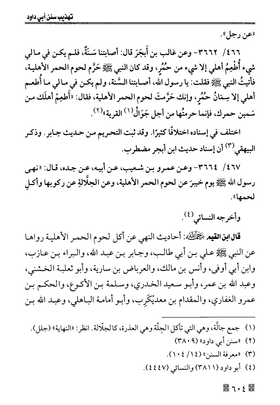 ٤٦٦/ ٣٦٦٢ - وعن غالب بن أَبجَرَ قال: أصابتنا سَنَةٌ، فلم يكن في مالي شيء أُطْعِمُ أهلي إلا شيء من حُمُرٍ، وقد كان النبي - صلى الله عليه وسلم - حَرَّم لحوم الحمر الأهلية، فأتيتُ النبي - صلى الله عليه وسلم - فقلت: يا رسول الله، أصابتنا السَّنة، ولم يكن في مالي ما أُطعم أهلي إلا سِمَانُ حُمُرٍ، وإنك حَرَّمتَ لحوم الحمر الأهلية، فقال: «أَطعِمْ أهلَك من سَمين حمرك، فإنما حرمتُها من أجل جَوَالِّ (¬١) القرية» (¬٢).