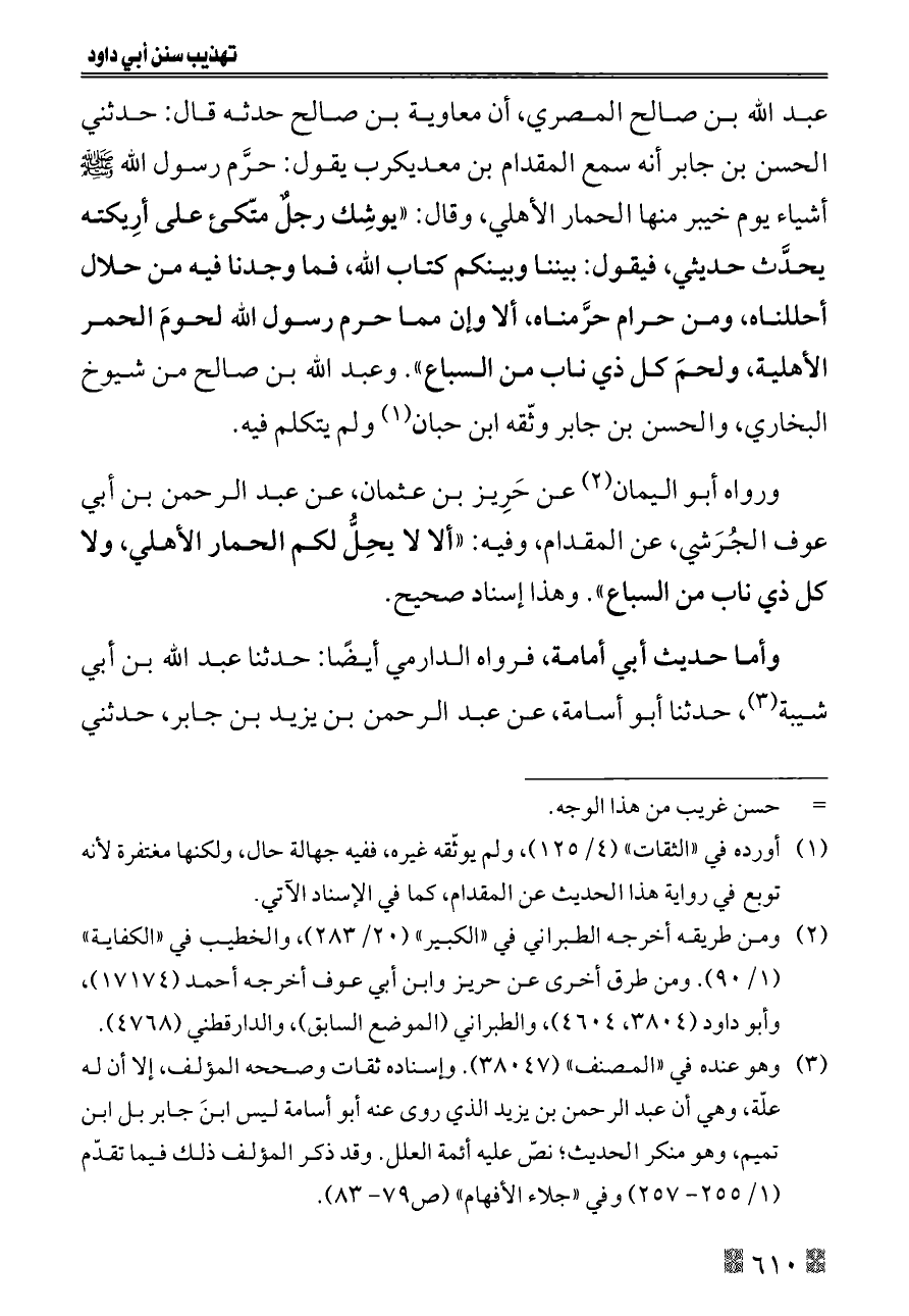 عبد الله بن صالح المصري، أن معاوية بن صالح حدثه قال: حدثني الحسن بن جابر أنه سمع المقدام بن معديكرب يقول: حرَّم رسول الله - صلى الله عليه وسلم - أشياء يوم خيبر منها الحمار الأهلي، وقال: «يوشِك رجلٌ متّكئ على أرِيكته يحدَّث حديثي، فيقول: بيننا وبينكم كتاب الله، فما وجدنا فيه من حلال أحللناه، ومن حرام حرَّمناه، ألا وإن مما حرم رسول الله لحومَ الحمر الأهلية، ولحمَ كل ذي ناب من السباع». وعبد الله بن صالح من شيوخ البخاري، والحسن بن جابر وثّقه ابن حبان (¬١) ولم يتكلم فيه.