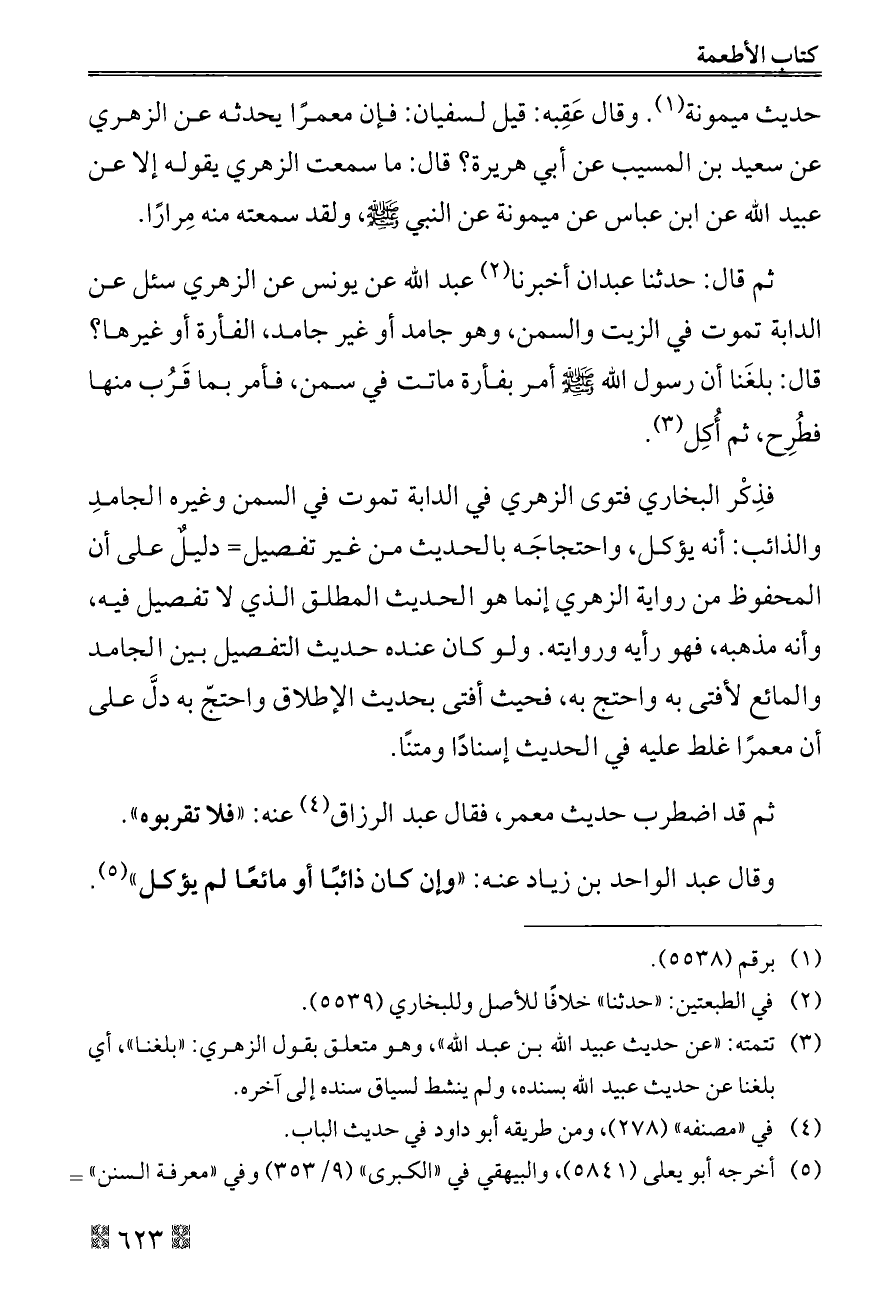 فذِكْر البخاري فتوى الزهري في الدابة تموت في السمن وغيره الجامدِ والذائب: أنه يؤكل، واحتجاجَه بالحديث من غير تفصيل= دليلٌ على أن المحفوظ من رواية الزهري إنما هو الحديث المطلق الذي لا تفصيل فيه، وأنه مذهبه، فهو رأيه وروايته. ولو كان عنده حديث التفصيل بين الجامد والمائع لأفتى به واحتج به، فحيث أفتى بحديث الإطلاق واحتجّ به دلَّ على أن معمرًا غلط عليه في الحديث إسنادًا ومتنًا.