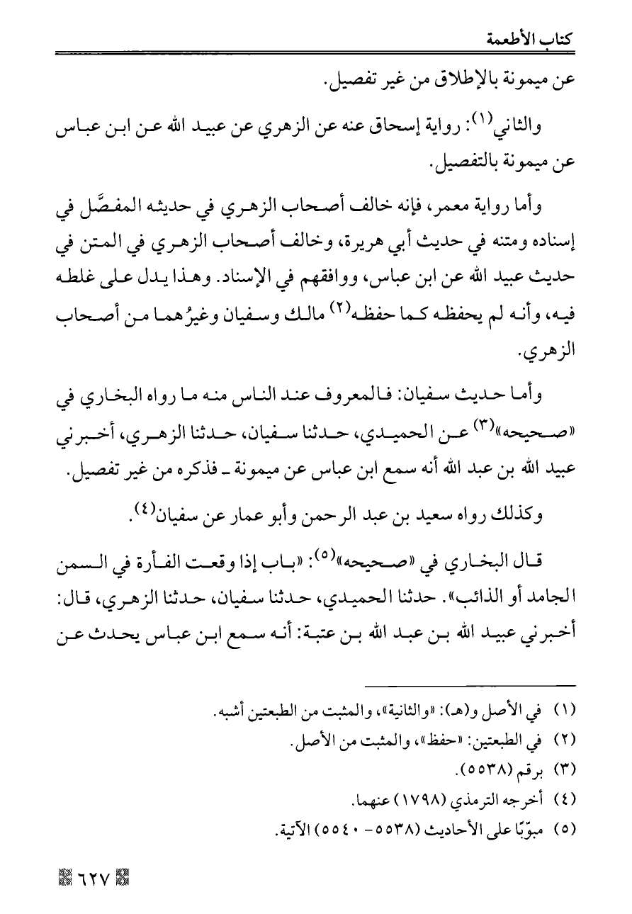 قال البخاري في «صحيحه» (¬٥): «باب إذا وقعت الفأرة في السمن الجامد أو الذائب». حدثنا الحميدي، حدثنا سفيان، حدثنا الزهري، قال: أخبرني عبيد الله بن عبد الله بن عتبة: أنه سمع ابن عباس يحدث عن