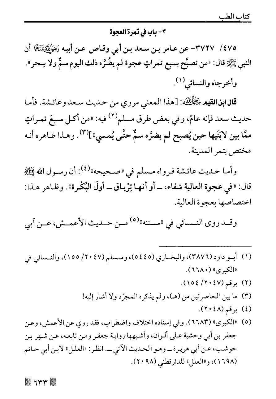 ٤٧٥/ ٣٧٢٧ - عن عامر بن سعد بن أبي وقاص عن أبيه - رضي الله عنهما - أن النبي - صلى الله عليه وسلم - قال: «من تصبَّح بسبع تمراتٍ عجوة لم يضُرَّه ذلك اليوم سمٌّ ولا سِحر».