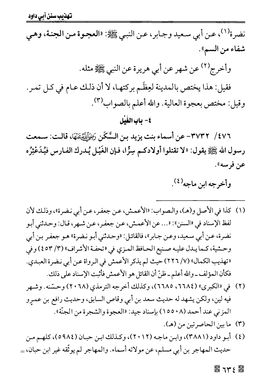 (¬١) كذا في الأصل و (هـ)، والصواب: «الأعمش، عن جعفر، عن أبي نضرة»، وذلك لأن لفظ الإسناد في «السنن»: « ... عن الأعمش، عن جعفر، عن شهر، قال: وحدثني أبو نضرة، عن أبي سعيد، وعن جابر»، فالقائل: «وحدثني أبو نضرة» هو جعفر بن أبي وحشية، كما يدل عليه صنيع الحافظ المزي في «تحفة الأشراف» (٣/ ٤٥٣) وفي «تهذيب الكمال» (٧/ ٢٢٦) حيث لم يذكر الأعمش في الرواة عن أبي نضرة العبدي. فكأن المؤلف ــ والله أعلم ــ ظنّ أن القائل هو الأعمش فأثبت الإسناد على ذلك.