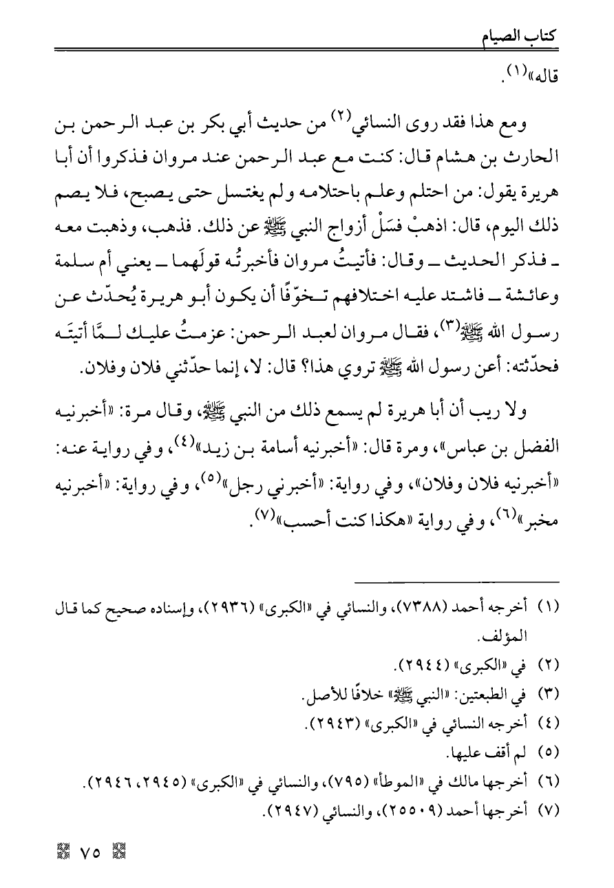 ومع هذا فقد روى النسائي (¬٢) من حديث أبي بكر بن عبد الرحمن بن الحارث بن هشام قال: كنت مع عبد الرحمن عند مروان فذكروا أن أبا هريرة يقول: من احتلم وعلم باحتلامه ولم يغتسل حتى يصبح، فلا يصم ذلك اليوم، قال: اذهبْ فسَلْ أزواج النبي - صلى الله عليه وسلم - عن ذلك. فذهب، وذهبت معه ــ فذكر الحديث ــ وقال: فأتيتُ مروان فأخبرتُه قولَهما ــ يعني أم سلمة وعائشة ــ فاشتد عليه اختلافهم تخوّفًا أن يكون أبو هريرة يُحدّث عن رسول الله - صلى الله عليه وسلم - (¬٣)، فقال مروان لعبد الرحمن: عزمتُ عليك لمَّا أتيتَه فحدّثته: أعن رسول الله - صلى الله عليه وسلم - تروي هذا؟ قال: لا، إنما حدّثني فلان وفلان.