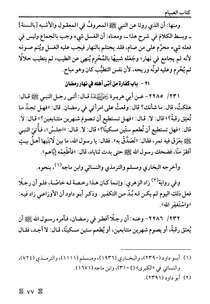 ٢٣١/ ٢٢٨٥ - عن أبي هريرة - رضي الله عنه - قال: أتى رجل النبي - صلى الله عليه وسلم - قال: هلكتُ، قال: ما شأنك؟ قال: وقعتُ على امرأتي في رمضان. قال: «فهل تجدُ ما تُعتِق رقبةً؟» قال: لا. قال: «فهل تستطيع أن تصومَ شهرين متتابعين؟» قال: لا. قال: «فهل تستطيع أن تُطعم ستّين مسكينًا؟» قال: لا. قال: «اجلسْ»، فأُتيَ النبي - صلى الله عليه وسلم - بعَرَق فيه تمر، فقال: «تَصَدَّقْ به». فقال: يا رسول الله، ما بين لَابَتَيها أهلُ بيتٍ أفقرَ منّا، فضحك رسول الله - صلى الله عليه وسلم - حتى بدت ثناياه، قال: «فأطْعِمْه إيَّاهم».