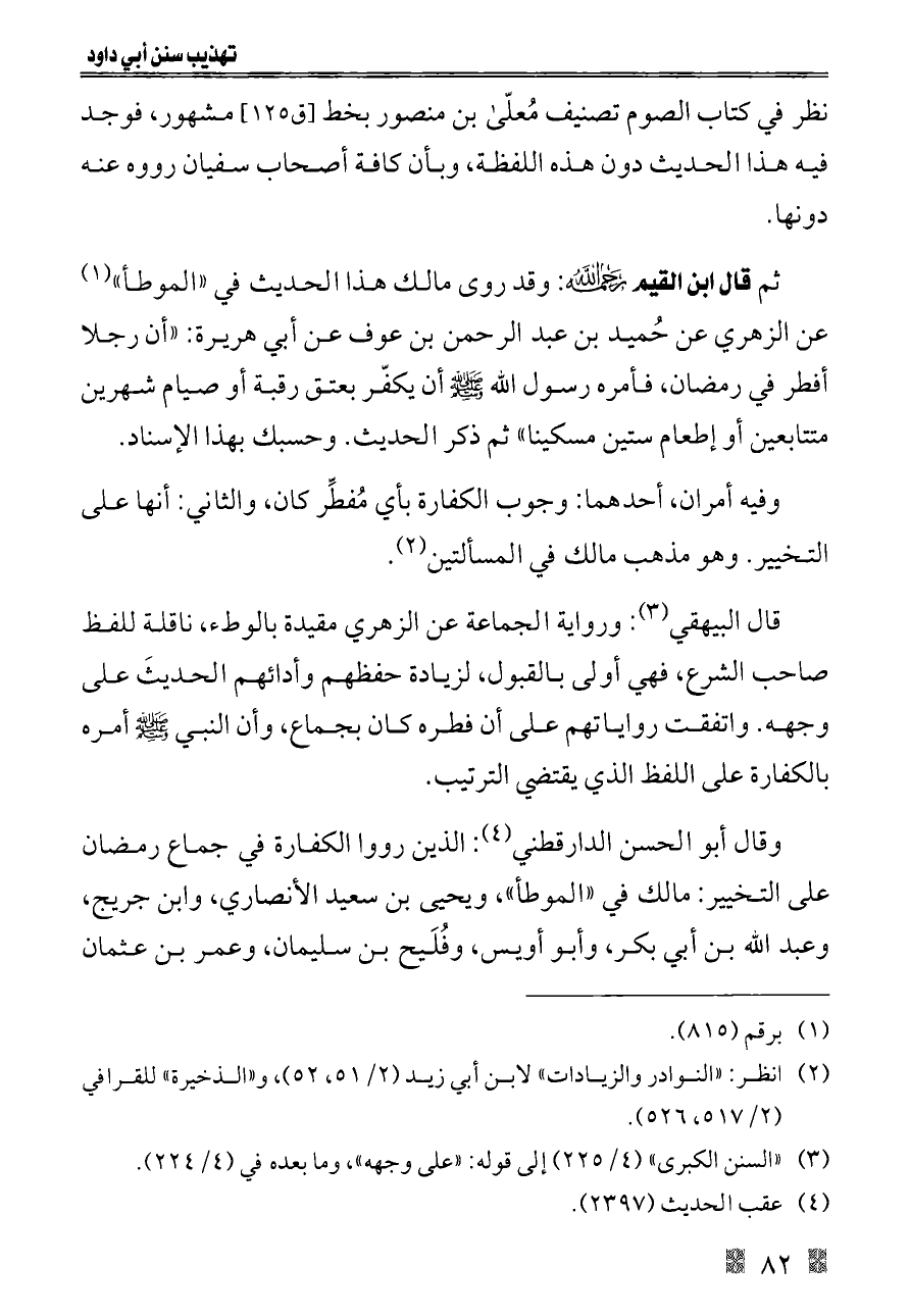 ثم قال ابن القيم - رحمه الله -: وقد روى مالك هذا الحديث في «الموطأ» (¬١) عن الزهري عن حُميد بن عبد الرحمن بن عوف عن أبي هريرة: «أن رجلا أفطر في رمضان، فأمره رسول الله - صلى الله عليه وسلم - أن يكفّر بعتق رقبة أو صيام شهرين متتابعين أو إطعام ستين مسكينا» ثم ذكر الحديث. وحسبك بهذا الإسناد.