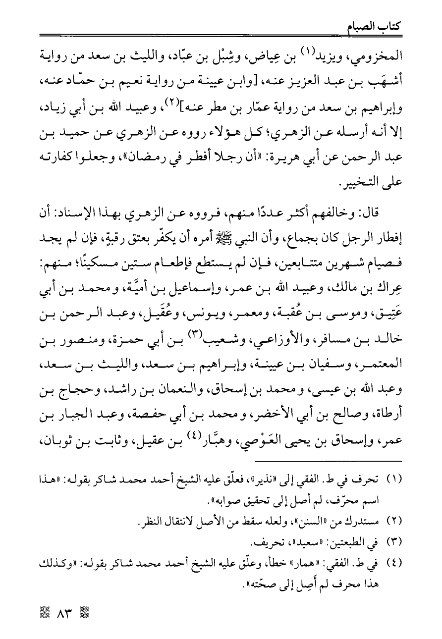 قال: وخالفهم أكثر عددًا منهم، فرووه عن الزهري بهذا الإسناد: أن إفطار الرجل كان بجماع، وأن النبي - صلى الله عليه وسلم - أمره أن يكفّر بعتق رقبةٍ، فإن لم يجد فصيام شهرين متتابعين، فإن لم يستطع فإطعام ستين مسكينًا؛ منهم: عِراك بن مالك، وعبيد الله بن عمر، وإسماعيل بن أميَّة، ومحمد بن أبي عَتِيق، وموسى بن عُقبة، ومعمر، ويونس، وعُقَيل، وعبد الرحمن بن خالد بن مسافر، والأوزاعي، وشعيب (¬٣) بن أبي حمزة، ومنصور بن المعتمر، وسفيان بن عيينة، وإبراهيم بن سعد، والليث بن سعد، وعبد الله بن عيسى، ومحمد بن إسحاق، والنعمان بن راشد، وحجاج بن أرطاة، وصالح بن أبي الأخضر، ومحمد بن أبي حفصة، وعبد الجبار بن عمر، وإسحاق بن يحيى العَوْصي، وهبَّار (¬٤) بن عقيل، وثابت بن ثوبان،