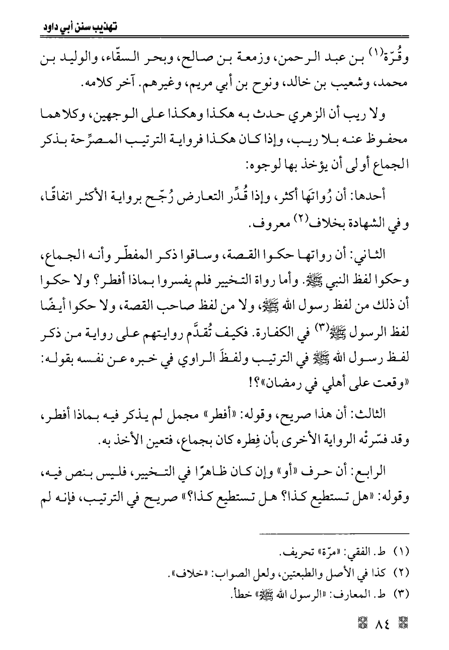 ولا ريب أن الزهري حدث به هكذا وهكذا على الوجهين، وكلاهما محفوظ عنه بلا ريب، وإذا كان هكذا فرواية الترتيب المصرِّحة بذكر الجماع أولى أن يؤخذ بها لوجوه: