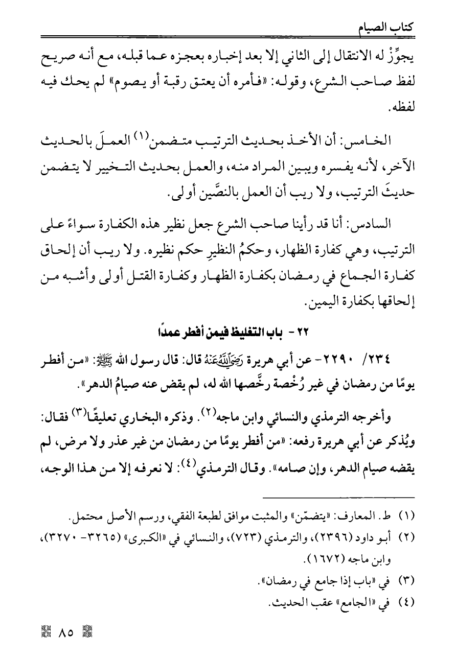 ٢٣٤/ ٢٢٩٠ - عن أبي هريرة - رضي الله عنه - قال: قال رسول الله - صلى الله عليه وسلم -: «من أفطر يومًا من رمضان في غير رُخْصة رخَّصها الله له، لم يقض عنه صيامُ الدهر».