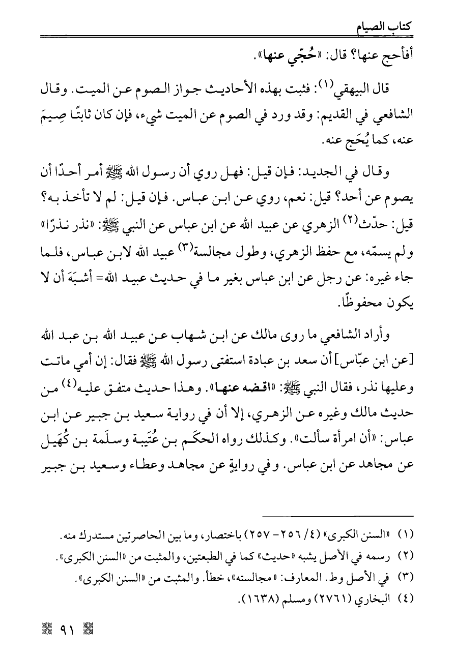 وقال في الجديد: فإن قيل: فهل روي أن رسول الله - صلى الله عليه وسلم - أمر أحدًا أن يصوم عن أحد؟ قيل: نعم، روي عن ابن عباس. فإن قيل: لم لا تأخذ به؟ قيل: حدّث (¬٢) الزهري عن عبيد الله عن ابن عباس عن النبي - صلى الله عليه وسلم -: «نذر نذرًا» ولم يسمّه، مع حفظ الزهري، وطول مجالسة (¬٣) عبيد الله لابن عباس، فلما جاء غيره: عن رجل عن ابن عباس بغير ما في حديث عبيد الله= أشبَهَ أن لا يكون محفوظًا.