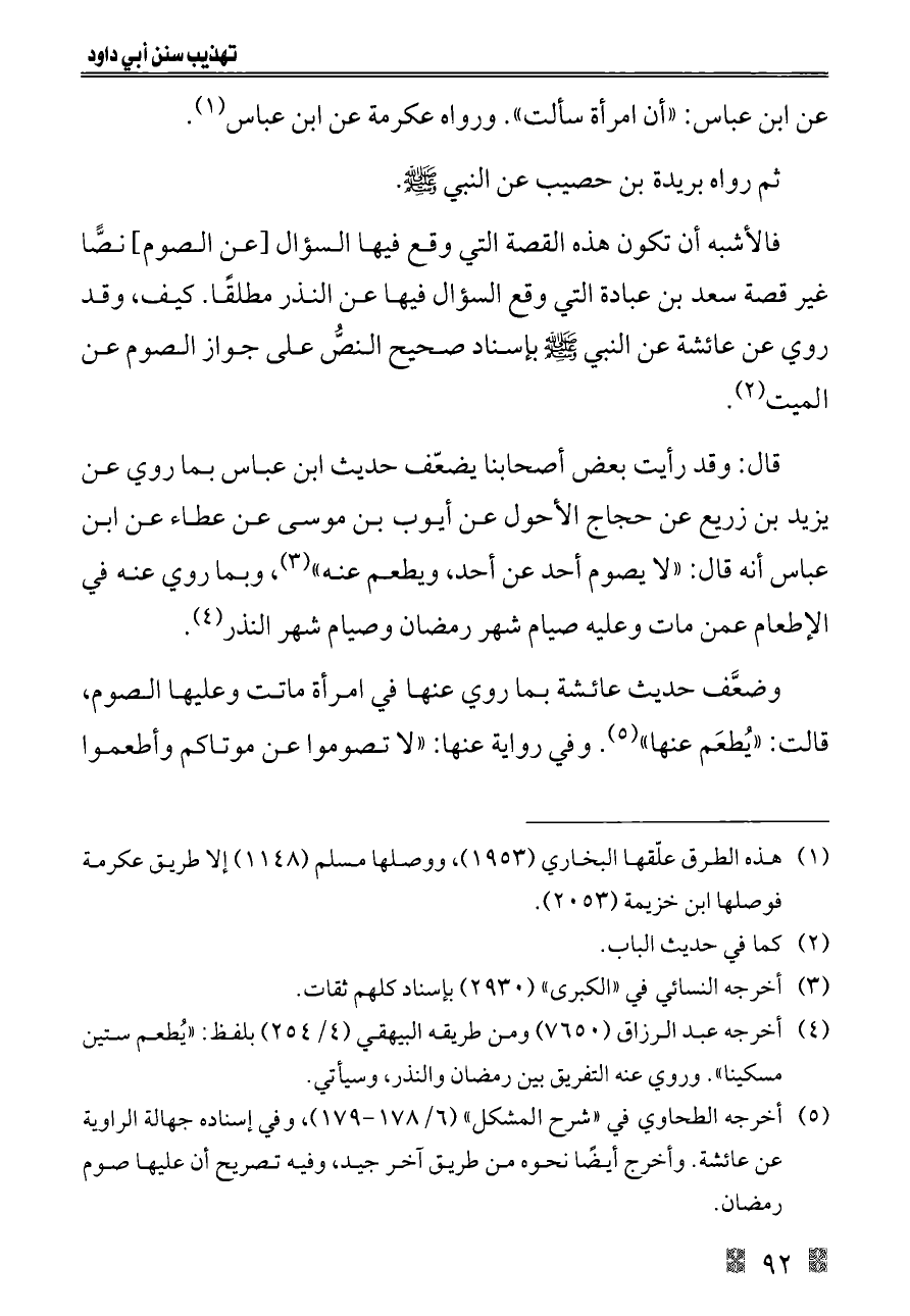 فالأشبه أن تكون هذه القصة التي وقع فيها السؤال [عن الصوم] نصًّا غير قصة سعد بن عبادة التي وقع السؤال فيها عن النذر مطلقًا. كيف، وقد روي عن عائشة عن النبي - صلى الله عليه وسلم - بإسناد صحيح النصُّ على جواز الصوم عن الميت (¬٢).