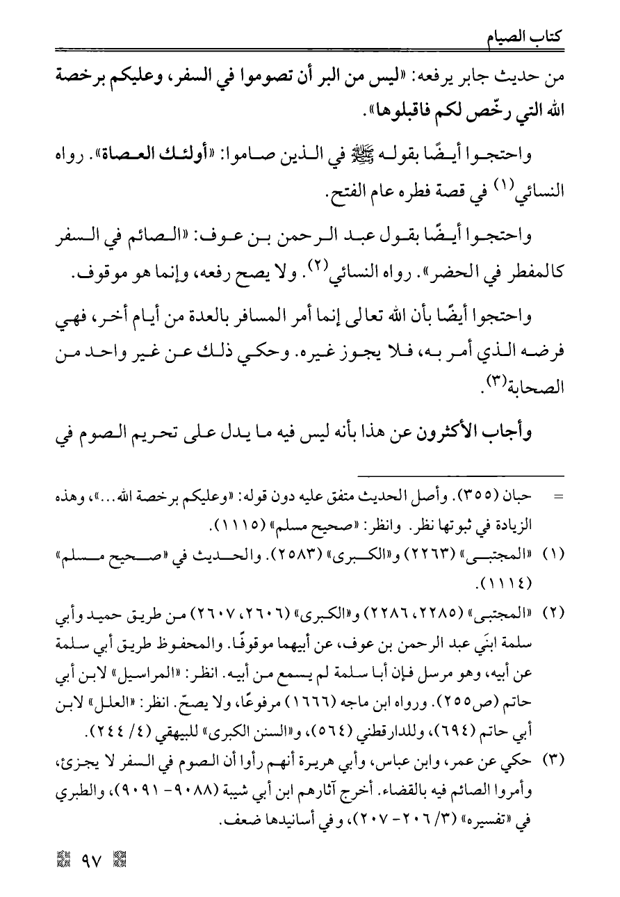 واحتجوا أيضًا بقول عبد الرحمن بن عوف: «الصائم في السفر كالمفطر في الحضر». رواه النسائي (¬٢). ولا يصح رفعه، وإنما هو موقوف.