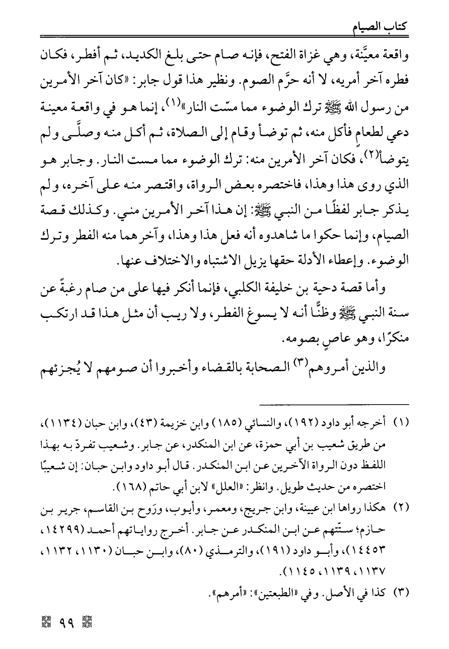 واقعة معيَّنة، وهي غزاة الفتح، فإنه صام حتى بلغ الكديد، ثم أفطر، فكان فطره آخر أمريه، لا أنه حرَّم الصوم. ونظير هذا قول جابر: «كان آخر الأمرين من رسول الله - صلى الله عليه وسلم - ترك الوضوء مما مسّت النار» (¬١)، إنما هو في واقعة معينة دعي لطعامٍ فأكل منه، ثم توضأ وقام إلى الصلاة، ثم أكل منه وصلَّى ولم يتوضأ (¬٢)، فكان آخر الأمرين منه: ترك الوضوء مما مست النار. وجابر هو الذي روى هذا وهذا، فاختصره بعض الرواة، واقتصر منه على آخره، ولم يذكر جابر لفظًا من النبي - صلى الله عليه وسلم -: إن هذا آخر الأمرين مني. وكذلك قصة الصيام، وإنما حكوا ما شاهدوه أنه فعل هذا وهذا، وآخرهما منه الفطر وترك الوضوء. وإعطاء الأدلة حقها يزيل الاشتباه والاختلاف عنها.