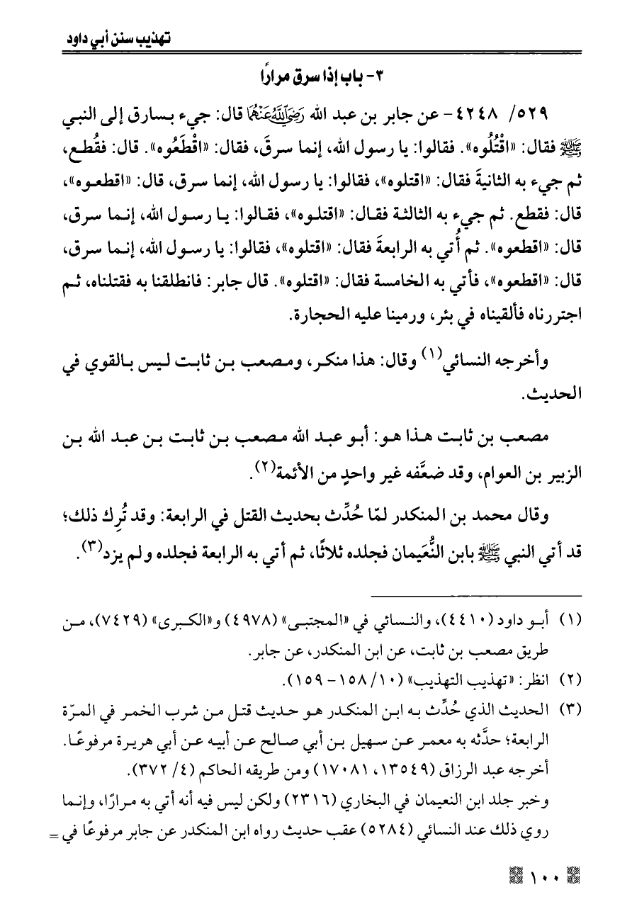 ٥٢٩/ ٤٢٤٨ - عن جابر بن عبد الله - رضي الله عنهما - قال: جيء بسارق إلى النبي - صلى الله عليه وسلم - فقال: «اقْتُلُوه». فقالوا: يا رسول الله، إنما سرقَ، فقال: «اقْطَعُوه». قال: فقُطع، ثم جيء به الثانيةَ فقال: «اقتلوه»، فقالوا: يا رسول الله، إنما سرق، قال: «اقطعوه»، قال: فقطع. ثم جيء به الثالثة فقال: «اقتلوه»، فقالوا: يا رسول الله، إنما سرق، قال: «اقطعوه». ثم أُتي به الرابعةَ فقال: «اقتلوه»، فقالوا: يا رسول الله، إنما سرق، قال: «اقطعوه»، فأتي به الخامسة فقال: «اقتلوه». قال جابر: فانطلقنا به فقتلناه، ثم اجتررناه فألقيناه في بئر، ورمينا عليه الحجارة.