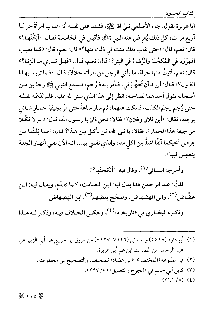 أبا هريرة يقول: جاء الأسلمي نبيَّ الله - صلى الله عليه وسلم -، فشهد على نفسه أنه أصاب امرأةً حرامًا أربع مرات، كل ذلك يُعرِض عنه النبي - صلى الله عليه وسلم -، فأقبل في الخامسة فقال: «أنِكْتَها؟» قال: نعم، قال: «حتى غاب ذلك منك في ذلك منها؟» قال: نعم، قال: «كما يغيب المِرْوَد في المُكحُلة والرِّشاءُ في البئر؟» قال: نعم، قال: «فهل تدري ما الزنا؟» قال: نعم، أتيتُ منها حرامًا ما يأتي الرجل من امرأته حلالًا، قال: «فما تريد بهذا القول؟» قال: أريد أن تُطهِّرَني، فأمر به فرُجم، فسمع النبي - صلى الله عليه وسلم - رجلين من أصحابه يقول أحدهما لصاحبه: انظر إلى هذا الذي ستر الله عليه، فلم تَدَعْه نفسُه حتى رُجِم رجمَ الكلب، فسكت عنهما، ثم سار ساعةً حتى مرَّ بجيفةِ حمارٍ شائلٍ برجله، فقال: «أين فلان وفلان؟» فقالا: نحن ذان يا رسول الله، قال: «انزلا فكُلا من جيفةِ هذا الحمار»، فقالا: يا نبي الله، مَن يأكل مِن هذا؟ قال: «فما نِلتُما من عِرض أخيكما آنفًا أشدُّ مِن أكلٍ منه، والذي نفسي بيده، إنه الآن لفي أنهار الجنة ينغمِس فيها».