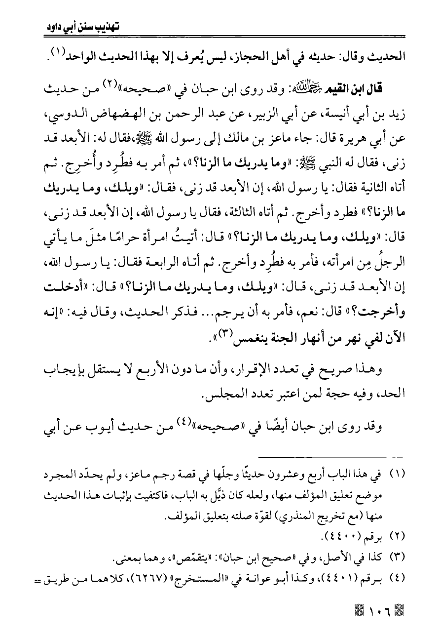 قال ابن القيم - رحمه الله -: وقد روى ابن حبان في «صحيحه» (¬٢) من حديث زيد بن أبي أنيسة، عن أبي الزبير، عن عبد الرحمن بن الهضهاض الدوسي، عن أبي هريرة قال: جاء ماعز بن مالك إلى رسول الله - صلى الله عليه وسلم -،فقال له: الأبعد قد زنى، فقال له النبي - صلى الله عليه وسلم -: «وما يدريك ما الزنا؟»، ثم أمر به فطُرِد وأُخرِج. ثم أتاه الثانية فقال: يا رسول الله، إن الأبعد قد زنى، فقال: «ويلك، وما يدريك ما الزنا؟» فطرد وأخرج. ثم أتاه الثالثة، فقال يا رسول الله، إن الأبعد قد زنى، قال: «ويلك، وما يدريك ما الزنا؟» قال: أتيتُ امرأة حرامًا مثلَ ما يأتي الرجلُ مِن امرأته، فأمر به فطُرِد وأخرج. ثم أتاه الرابعة فقال: يا رسول الله، إن الأبعد قد زنى، قال: «ويلك، وما يدريك ما الزنا؟» قال: «أدخلت وأخرجت؟» قال: نعم، فأمر به أن يرجم ... فذكر الحديث، وقال فيه: «إنه الآن لفي نهر من أنهار الجنة ينغمس (¬٣)».