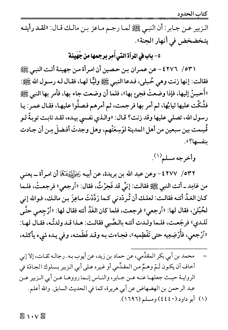 ٥٣١/ ٤٢٧٦ - عن عمران بن حصين أن امرأة من جهينة أتت النبي - صلى الله عليه وسلم - فقالت: إنها زنت وهي حُبلى، فدعا النبي - صلى الله عليه وسلم - وليًّا لها، فقال له رسول الله - صلى الله عليه وسلم -: «أَحسِنْ إليها، فإذا وضعتْ فجئ بها»، فلما أن وضعت جاء بها، فأمر بها النبي - صلى الله عليه وسلم - فشُكَّت عليها ثيابُها، ثم أمر بها فرجمت، ثم أمرهم فصلَّوا عليها، فقال عمر: يا رسول الله، تصلي عليها وقد زنت؟ قال: «والذي نفسي بيده، لقد تابت توبةً لو قُسِمت بين سبعين من أهل المدينة لوَسِعَتْهم، وهل وجدتَ أفضلَ مِن أن جادت بنفسها؟».