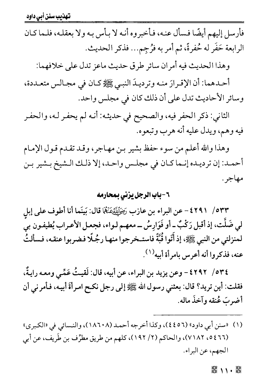 ٥٣٤/ ٤٢٩٢ - وعن يزيد بن البراء، عن أبيه، قال: لَقيتُ عَمِّي ومعه رايةٌ، فقلت: أين تريد؟ قال: بعثني رسول الله - صلى الله عليه وسلم - إلى رجل نكح امرأةَ أبيه، فأمرني أن أضربَ عُنقه وآخذَ ماله.