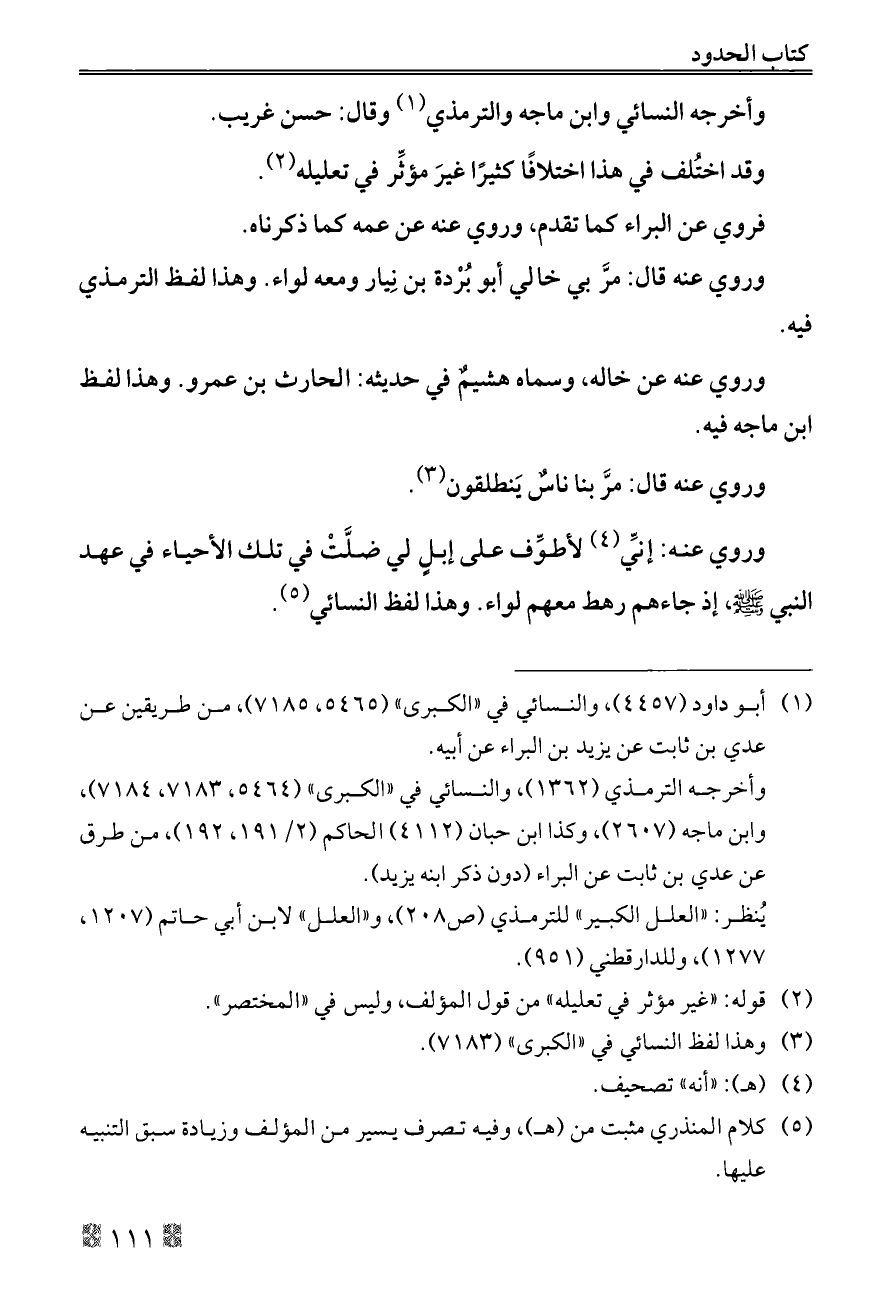 وروي عنه قال: مرَّ بي خالي أبو بُرْدة بن نِيار ومعه لواء. وهذا لفظ الترمذي فيه.