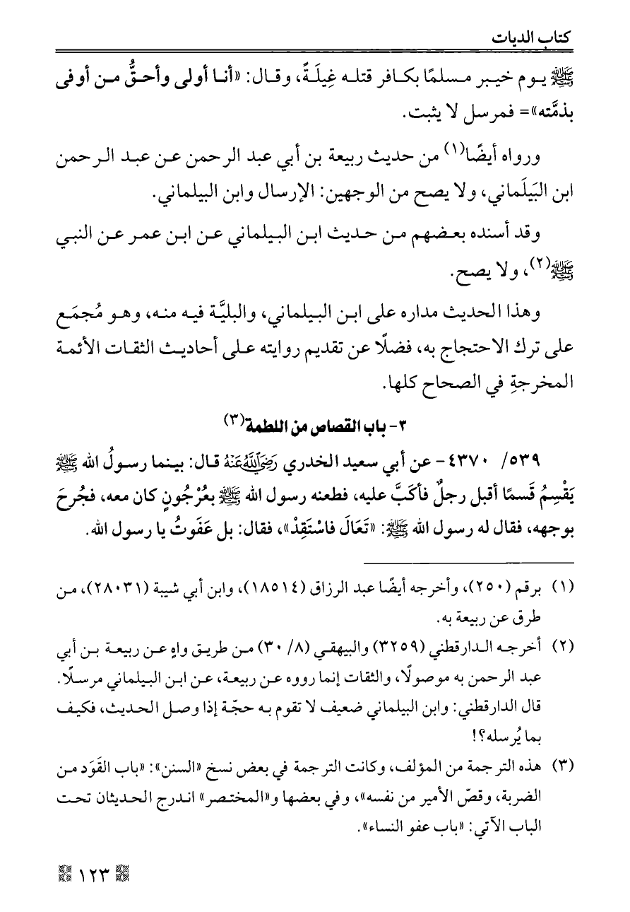 (¬٣) هذه الترجمة من المؤلف، وكانت الترجمة في بعض نسخ «السنن»: «باب القَوَد من الضربة، وقصّ الأمير من نفسه»، وفي بعضها و «المختصر» اندرج الحديثان تحت الباب الآتي: «باب عفو النساء».