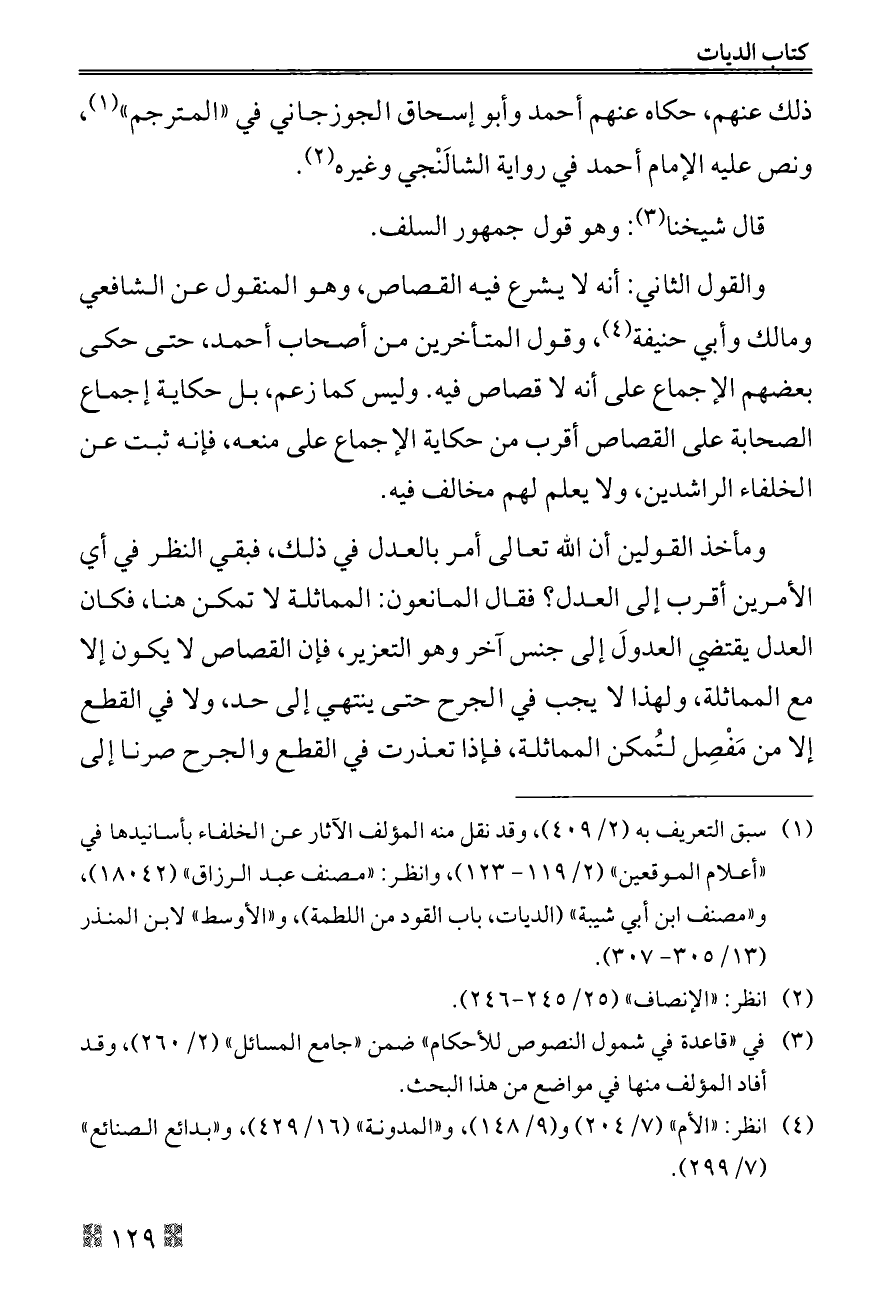 والقول الثاني: أنه لا يشرع فيه القصاص، وهو المنقول عن الشافعي ومالك وأبي حنيفة (¬٤)، وقول المتأخرين من أصحاب أحمد، حتى حكى بعضهم الإجماع على أنه لا قصاص فيه. وليس كما زعم، بل حكاية إجماع الصحابة على القصاص أقرب من حكاية الإجماع على منعه، فإنه ثبت عن الخلفاء الراشدين، ولا يعلم لهم مخالف فيه.