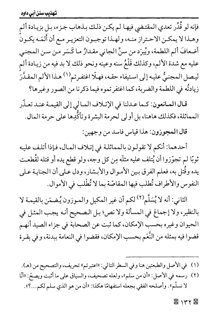 أحدهما: أنكم لا تقولون بالمماثلة في إتلاف المال، فإذا أتلف عليه ثوبًا لم تجوّزوا أن يُتلف عليه مثلَه مِن كل وجه، ولو قطع يده أو قتله لقُطعت يده وقُتل به، فعلم الفرق بين الأموال والأبشار، ودل على أن الجناية على النفوس والأطراف تُطلب فيها المقاصّة بما لا تُطْلب في الأموال.