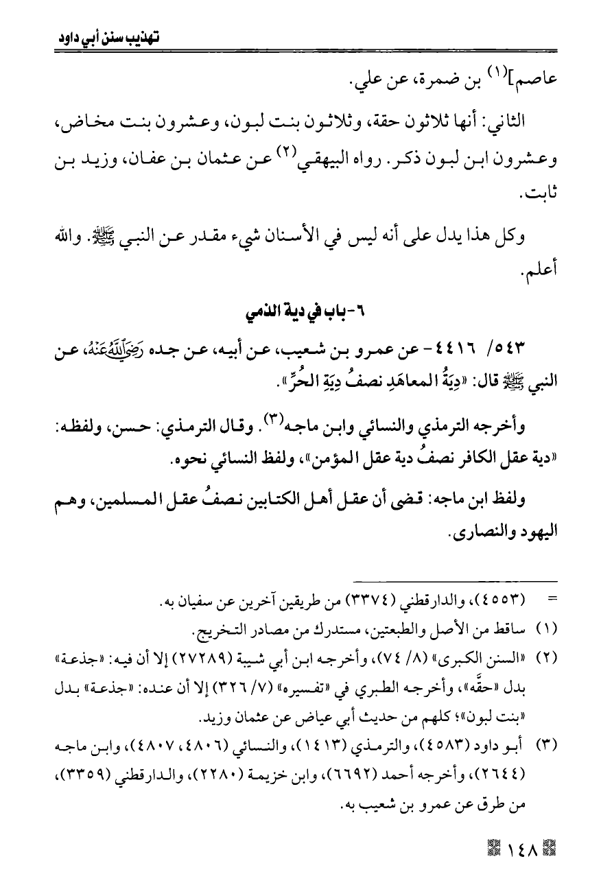 ٥٤٣/ ٤٤١٦ - عن عمرو بن شعيب، عن أبيه، عن جده - رضي الله عنه -، عن النبي - صلى الله عليه وسلم - قال: «دِيَةُ المعاهَدِ نصفُ دِيَةِ الحُرِّ».