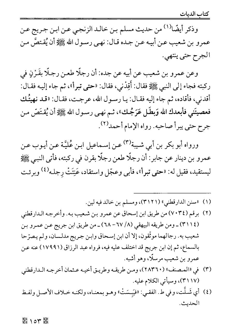 وعن عمرو بن شعيب عن أبيه عن جده: أن رجلًا طعن رجلًا بقَرْنٍ في ركبته فجاء إلى النبي - صلى الله عليه وسلم - فقال: أَقِدْني، فقال: «حتى تبرأ»، ثم جاء إليه فقال: أقدني، فأقاده، ثم جاء إليه فقال: يا رسول الله، عرجت، فقال: «قد نهيتُك فعصيتَني فأبعدك الله وَبطَل عَرَجُك»، ثم نهى رسول الله - صلى الله عليه وسلم - أن يُقتَصّ من جرح حتى يبرأ صاحبه. رواه الإمام أحمد (¬٢).