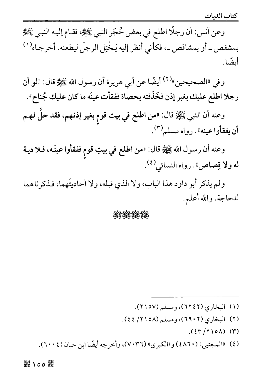 وعنه أن رسول الله - صلى الله عليه وسلم - قال: «من اطلع في بيتِ قومٍ ففقأوا عينَه، فلا دية له ولا قِصاص». رواه النسائي (¬٤).