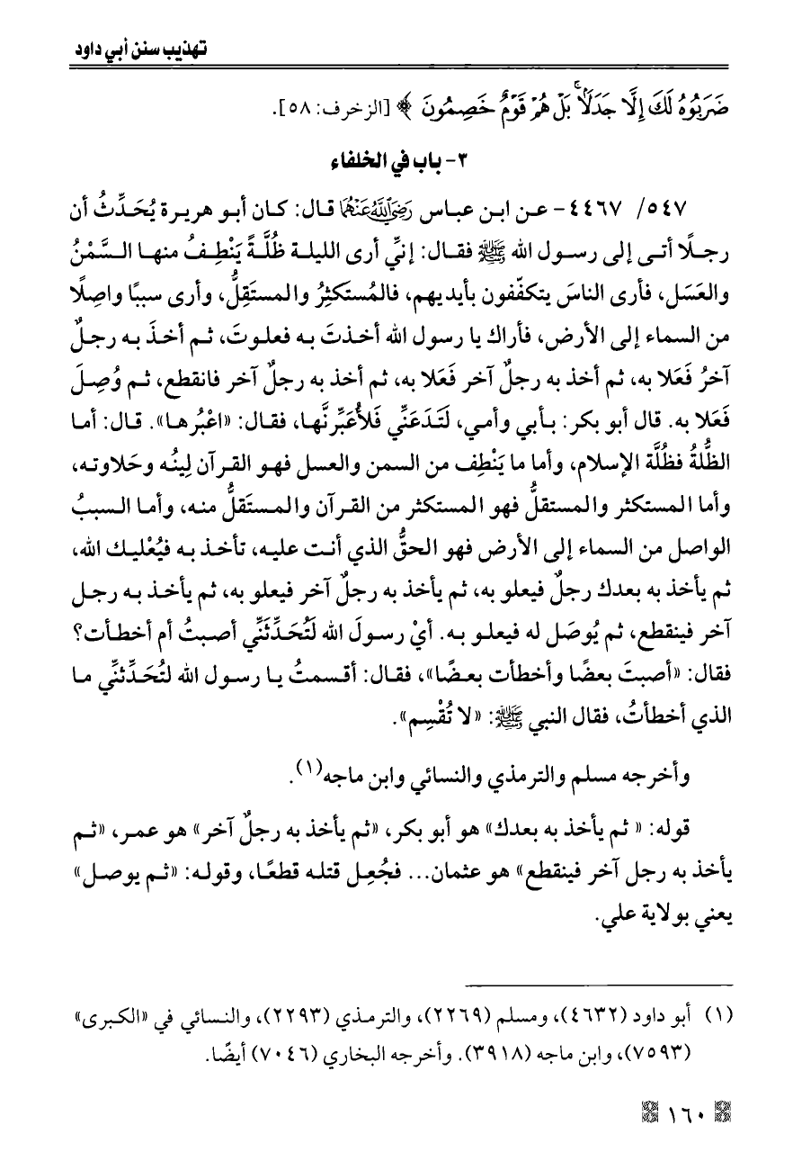 ٥٤٧/ ٤٤٦٧ - عن ابن عباس - رضي الله عنهما - قال: كان أبو هريرة يُحَدِّثُ أن رجلًا أتى إلى رسول الله - صلى الله عليه وسلم - فقال: إنِّي أرى الليلة ظُلَّةً يَنْطِفُ منها السَّمْنُ والعَسَل، فأرى الناسَ يتكفّفون بأيديهم، فالمُستَكثِرُ والمستَقِلُّ، وأرى سببًا واصِلًا من السماء إلى الأرض، فأراك يا رسول الله أخذتَ به فعلوتَ، ثم أخذَ به رجلٌ آخرُ فَعَلا به، ثم أخذ به رجلٌ آخر فَعَلا به، ثم أخذ به رجلٌ آخر فانقطع، ثم وُصِلَ فَعَلا به. قال أبو بكر: بأبي وأمي، لَتَدَعَنِّي فَلأُعَبِّرنَّها، فقال: «اعْبُرها». قال: أما الظُّلةُ فظُلَّة الإسلام، وأما ما يَنْطِف من السمن والعسل فهو القرآن لِينُه وحَلاوته، وأما المستكثر والمستقلُّ فهو المستكثر من القرآن والمستَقلُّ منه، وأما السببُ الواصل من السماء إلى الأرض فهو الحقُّ الذي أنت عليه، تأخذ به فيُعْليك الله، ثم يأخذ به بعدك رجلٌ فيعلو به، ثم يأخذ به رجلٌ آخر فيعلو به، ثم يأخذ به رجل آخر فينقطع، ثم يُوصَل له فيعلو به. أيْ رسولَ الله لَتُحَدِّثَنِّي أصبتُ أم أخطأت؟ فقال: «أصبتَ بعضًا وأخطأت بعضًا»، فقال: أقسمتُ يا رسول الله لتُحَدِّثنِّي ما الذي أخطأتُ، فقال النبي - صلى الله عليه وسلم -: «لا تُقْسِم».