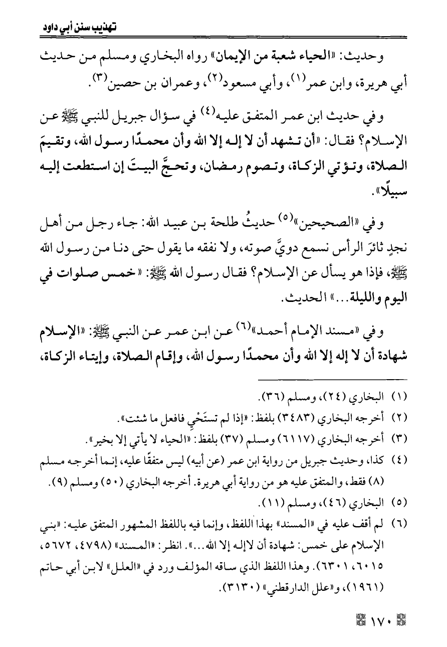 (¬٦) كذا، وحديث جبريل من رواية ابن عمر (عن أبيه) ليس متفقًا عليه، إنما أخرجه مسلم (٨) فقط، والمتفق عليه هو من رواية أبي هريرة. أخرجه البخاري (٥٠) ومسلم (٩).