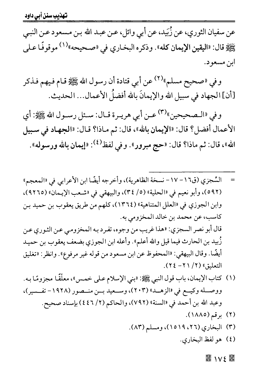 عن سفيان الثوري، عن زُبَيد، عن أبي وائل، عن عبد الله بن مسعود عن النبي - صلى الله عليه وسلم - قال: «اليقين الإيمان كله». وذكره البخاري في «صحيحه» (¬١) موقوفًا على ابن مسعود.