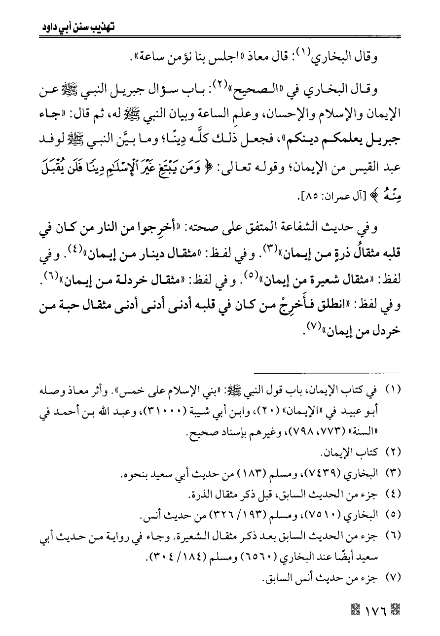وفي حديث الشفاعة المتفق على صحته: «أخرِجوا من النار من كان في قلبه مثقالُ ذرةٍ من إيمان» (¬٣). وفي لفظ: «مثقال دينار من إيمان» (¬٤). وفي لفظ: «مثقال شعيرة من إيمان» (¬٥). وفي لفظ: «مثقال خردلة من إيمان» (¬٦). وفي لفظ: «انطلق فأَخرِجْ من كان في قلبه أدنى أدنى أدنى مثقال حبة من خردل من إيمان» (¬٧).