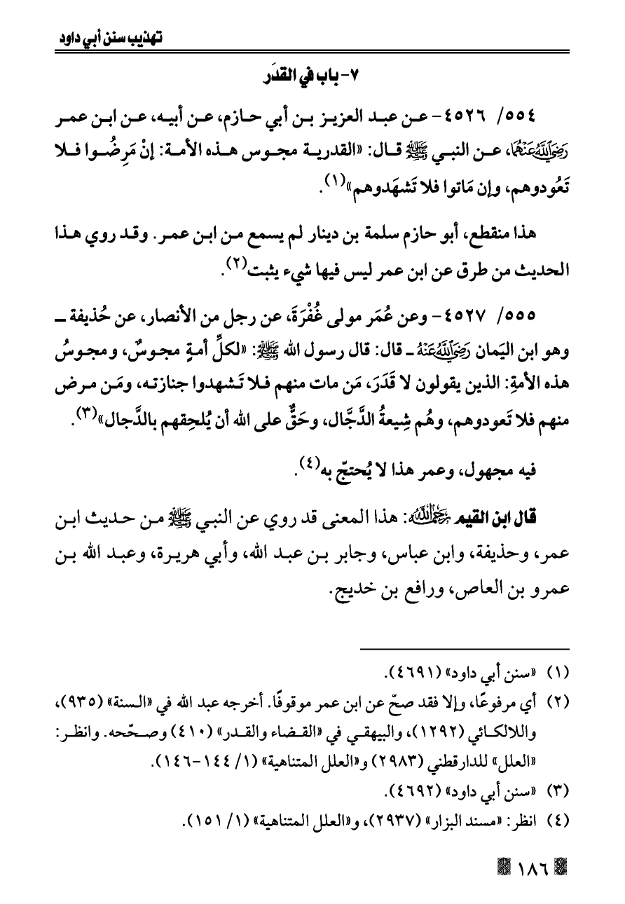 ٥٥٤/ ٤٥٢٦ - عن عبد العزيز بن أبي حازم، عن أبيه، عن ابن عمر - رضي الله عنهما -، عن النبي - صلى الله عليه وسلم - قال: «القدرية مجوس هذه الأمة: إنْ مَرِضُوا فلا تَعُودوهم، وإن مَاتوا فلا تَشهَدوهم» (¬١).